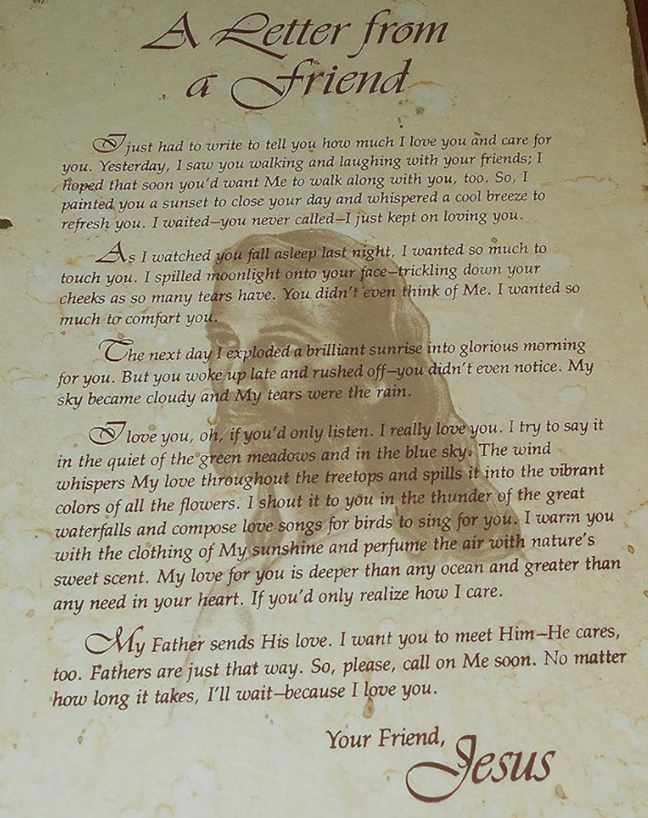 About a year after that, I was at a Hallmark store and saw a plaque with the poem, “A letter from a Friend”. I’ll include a copy of it at the end.