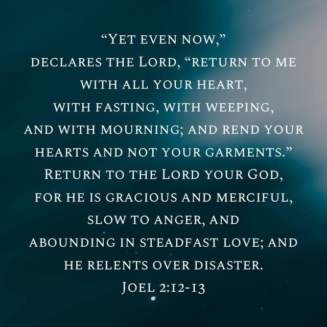 “Yet even now,” declares the Lord, “return to me with all your heart, with fasting, with weeping, and with mourning; and rend your hearts and not your garments.” Return to the Lord your God, for he is gracious and merciful, slow to anger, and abounding in steadfast love; and he relents over disaster.” Joel 2:12-13 ESV https://bible.com/bible/59/jol.2.12-13.ESV