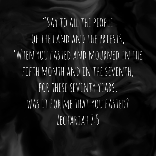 “Say to all the people of the land and the priests, ‘When you fasted and mourned in the fifth month and in the seventh, for these seventy years, was it for me that you fasted?” Zechariah 7:5 ESV https://bible.com/bible/59/zec.7.5.ESV