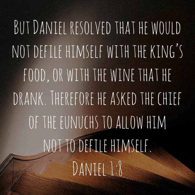 “But Daniel resolved that he would not defile himself with the king’s food, or with the wine that he drank. Therefore he asked the chief of the eunuchs to allow him not to defile himself.” Daniel 1:8 ESV https://bible.com/bible/59/dan.1.8.ESV