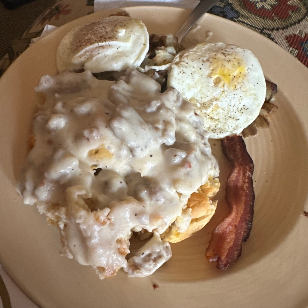 Pasta and Veggie Salad Sunny side up eggs over avocado spread and toastBiscuits and gravy with a side of breakfast potatoes, bacon and eggsSoft chicken tacos with a side of beans and Spanish riceBeef and cheese nachoAuthentic German Chocolate CakeChristmas ham with all the trimmings
